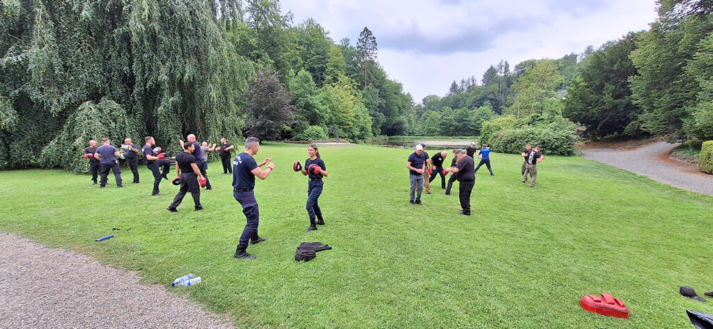 It was a sluggish start to scenario day but the morning saw the cobwebs blown off with a warm up and recap of some striking and combos. We did some ground fighting and baton work to finish off the start of the morning and then moved on to drills simulating perceptual distortion. We wore goggles that narrowed out view and ear defenders to replicate the symptoms of an adrenaline dump. We then drilled sprinting to the lake and back and had to face a scenario of violence and medical emergency. Great fun and hugely realistic. After lunch we moved on to the five scenarios. I won’t spoil what we did but several of them were pretty close to the bone for realism and eliciting genuine fight or flight responses from the folk on the course. This afternoon was worth the time and money alone.